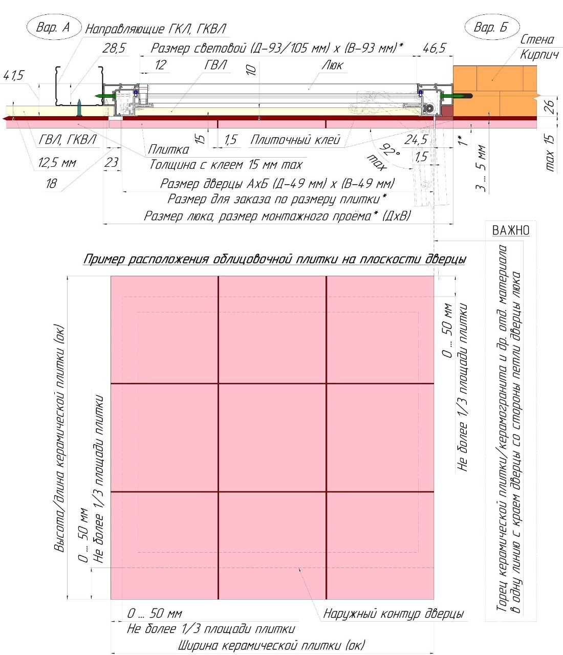 Дверца люка модели «Триумф» по умолчанию заполняется гипсоволоконным листом (ГВЛ) толщиной 10 мм, который идеально подходит для нанесения плиточного клея. По согласованию с заказчиком, заполнение дверцы можно выполнить влагостойким гипсокартоном (ГКЛВ) толщиной 9,5 мм.