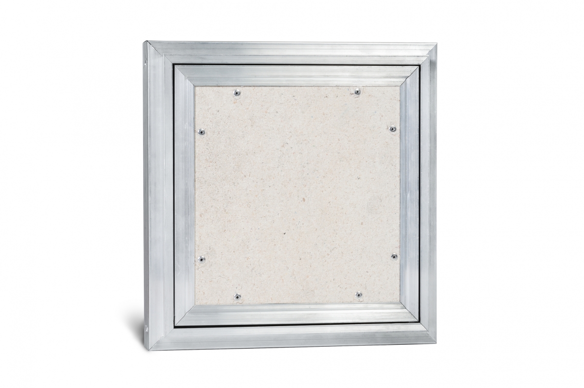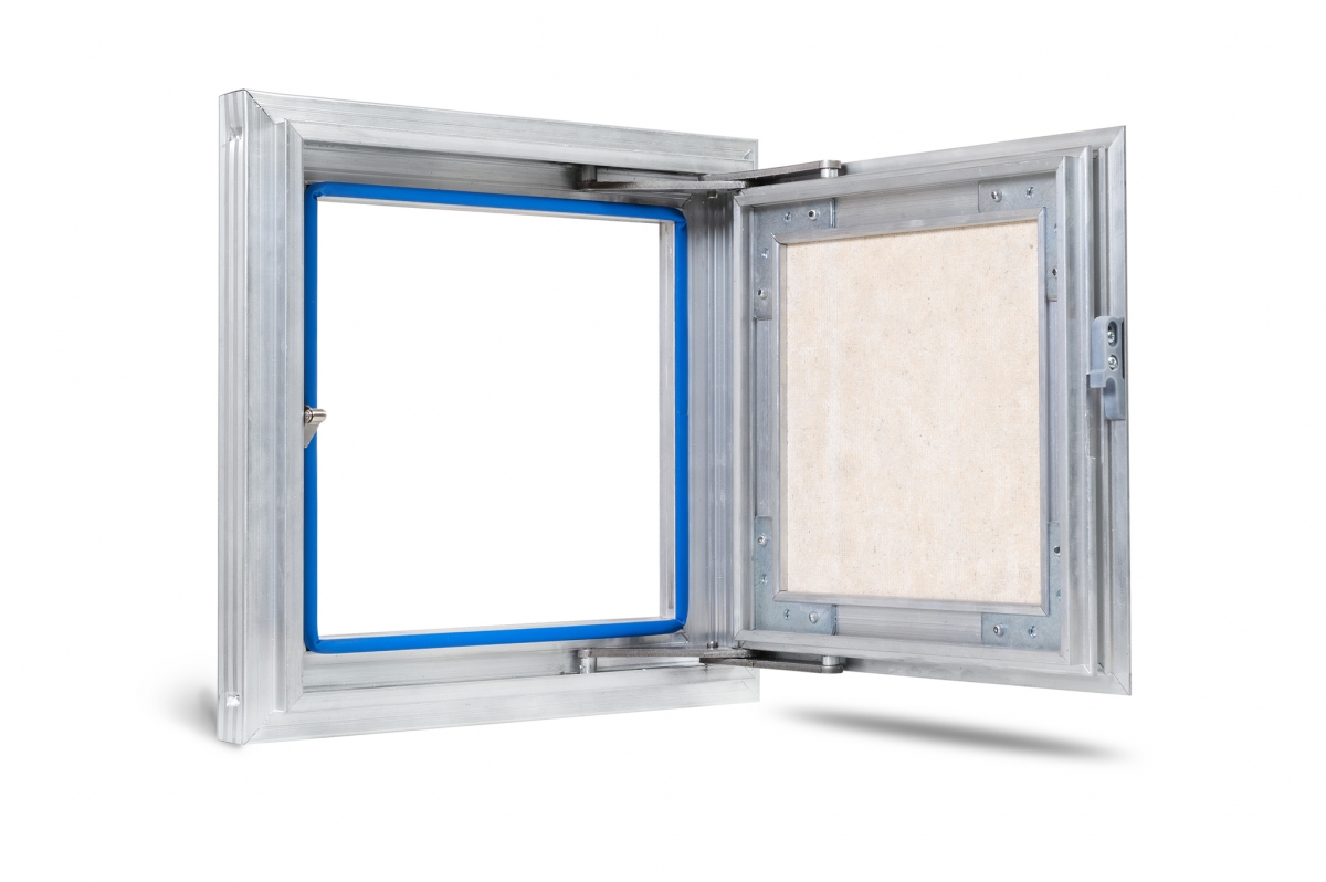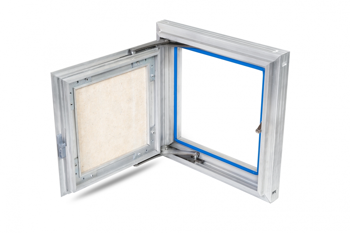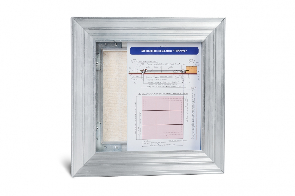 Рама люка для ревизии «Триумф» выполнена из алюминиевого профиля коробчатой формы и Г-образной в сечении для максимальной жесткости и удобства монтажа. Дверца люка изготавливается и алюминиевого профиля Т-образной формы, переменного сечения, с выраженными ребрами жесткости, что делает её конструкцию более жесткой в отличие от своих предшественников. Так как немаловажно исключить перекосы конструкции дверцы, чтобы не допустить деформации наклеенных на нее материалов. В отличие от наших конкурентов, толщина стенок алюминиевого профиля у нас по-прежнему 2 мм и более.