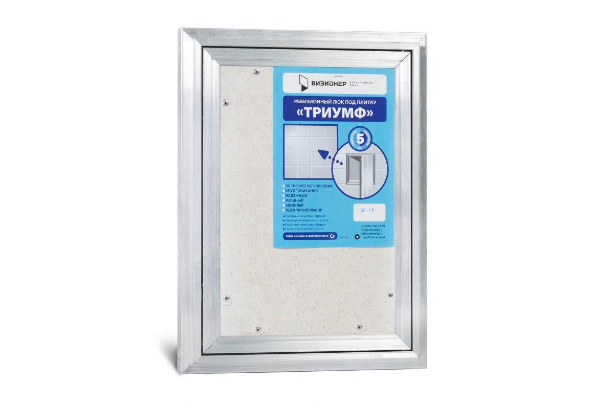 Люк, предназначен для последующей оклейки керамической плиткой, керамогранитом или другими листовыми материалами, суммарной толщиной материалов вместе с клеем, наносимых на дверцу, не более 15 мм. Люк под плитку «Триумф» сделает доступ к вашим инженерным коммуникациям максимально комфортным и минимально заметным! Чтобы открыть/закрыть дверцу, надо только легко нажать на нее, и более нет необходимости в применении дополнительных приспособлений (присоски, ручки, крючки, и т.п.).